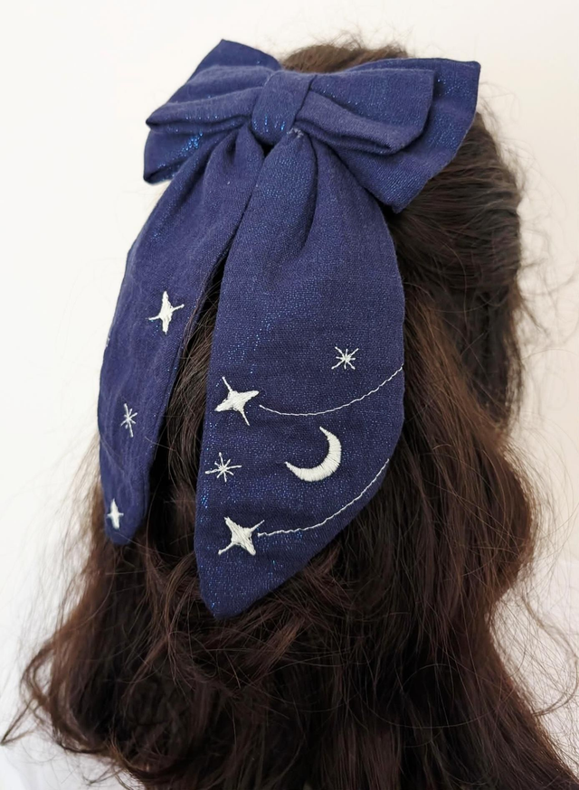Chaque nœud est brodé d'un motif constellation exclusif imaginé par nos soins. Ses deux pans sont ornés d’étoiles fines et lumineuses, pour un rendu délicat et féerique. Ce noeud à la particularité d’avoir un noeud papillon double pour offrir un volume délicat et une silhouette plus harmonieuse.